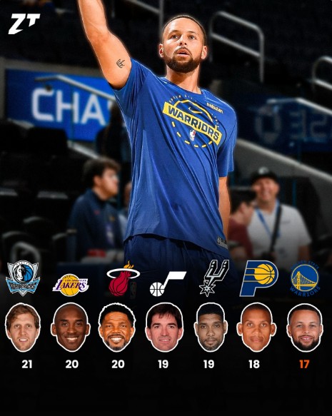 斯蒂芬-库里即将迎来为勇士队效力的第17个赛季融金牛,他也将成为NBA历史上第七位,为单一球队效力超过17年的球员。